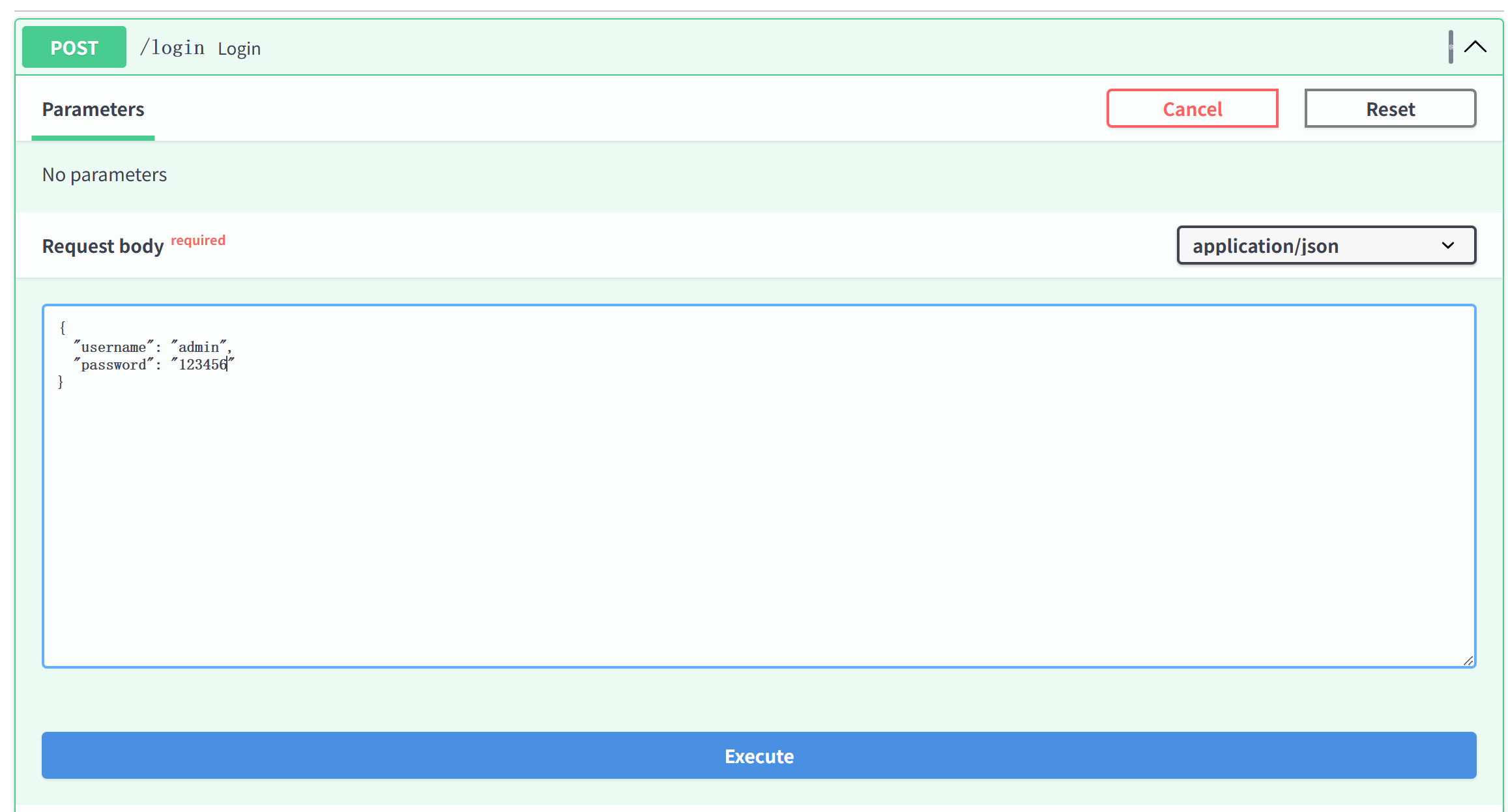 1. 登录:点击 /login,然后点击Try it out,编辑用户名和密码,输入账号 admin 和密码 123456,点击Execute。你会得到两个长长的字符串。 执行: login_execute 你会得到两个长长的字符串,一个是access_token,一个是refresh_token。 login_result