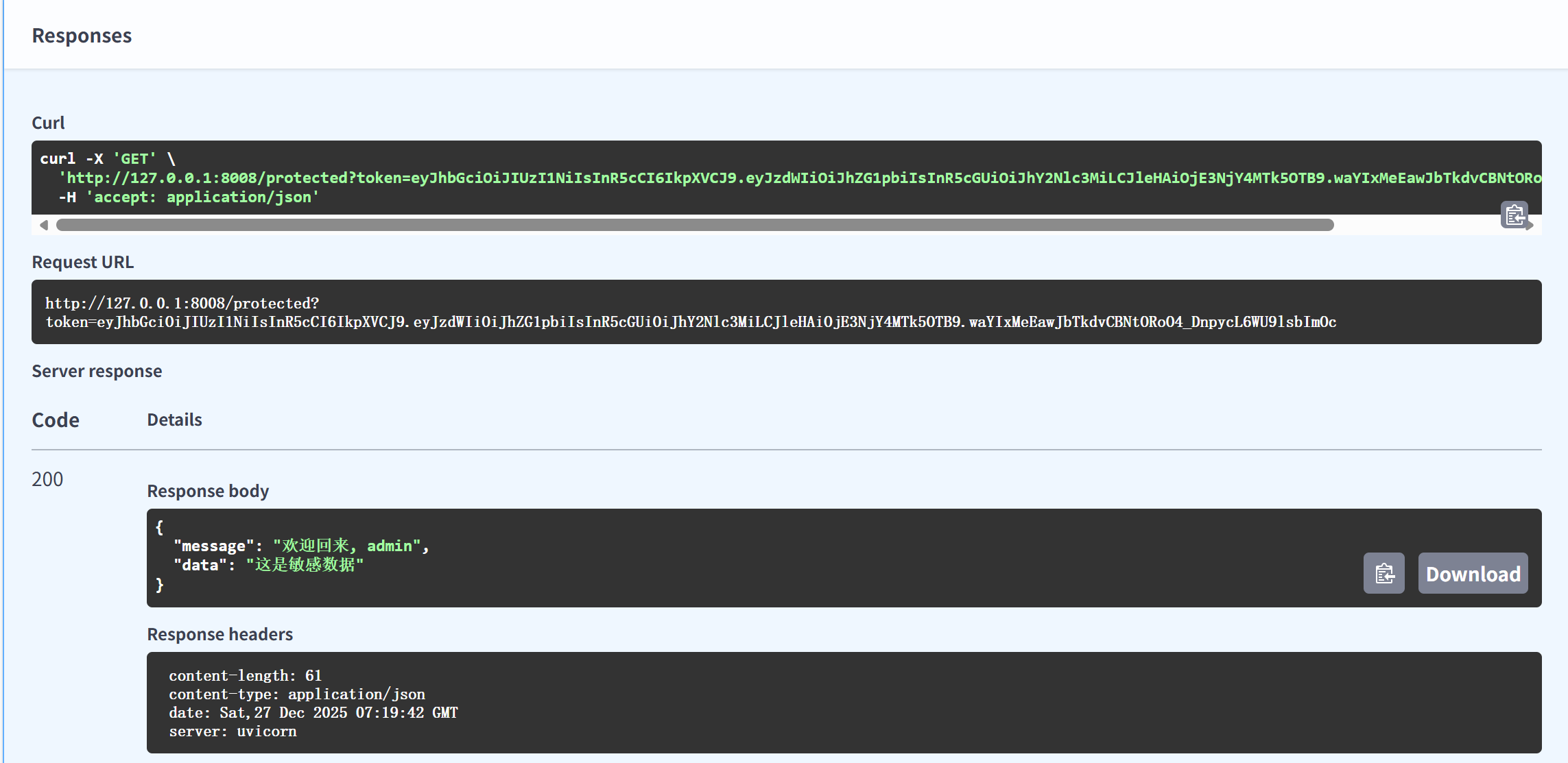 return {"message": f"欢迎回来, {payload['sub']}", "data": "这是敏感数据"}